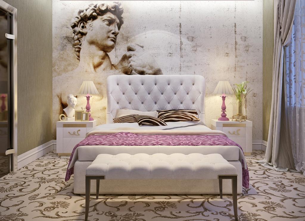 Спалнята в този стил е много уютна и в същото време елегантна. Има много тъкани тук: сатен и благородна коприна, от които много малки възглавници и покривки за легло са зашити на леглото, а мебелите са покрити с кърпа. Абажури и арт деко лампи с разсеяна светлина ще създадат неописуема атмосфера.