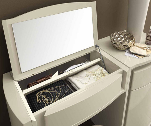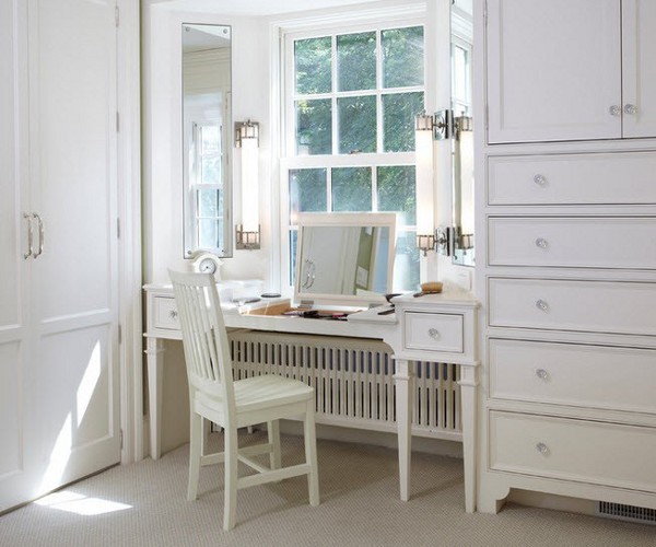 Будоарската маса с огледало често е отделен елемент: самата маса и огледалото, които стоят на нея или са прикрепени към стената. Изключително решение е ъгловата маса, защото ви позволява да използвате цялата площ на стаята, без да я натрупате. Ъгловата маса на будоар често се превръща в продължение на леглото. Сега тя е много по-функционална с появата на нови системи за съхранение, нови чекмеджета, което дава възможност да се използва маса за сто процента.
