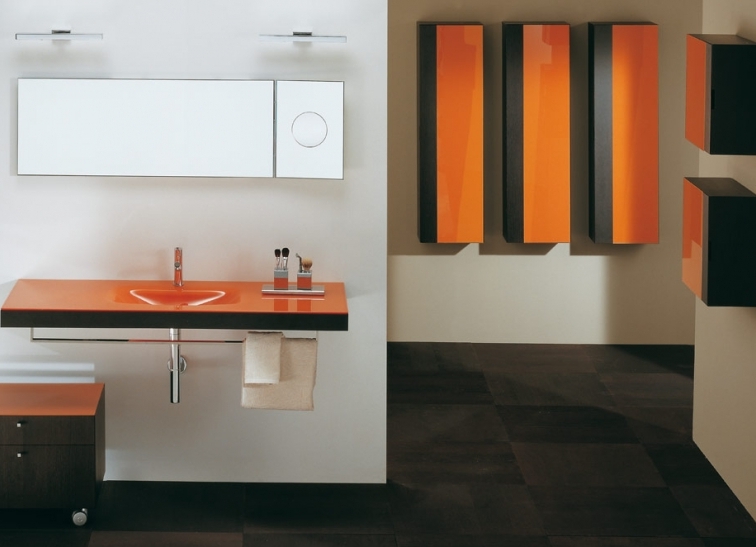За баня, високотехнологичните мебели често са изработени от метал или от стъкло и пластмаса. Тя има строго равна повърхност, лъскав или метален блясък. Стъклените рафтове се комбинират с хромирани детайли.