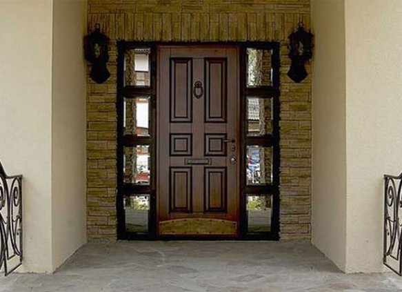 Уличната врата, изработена от твърдо дърво, е силна и издръжлива. Такава дървена врата, украсена с дърворезби, портали или платна с флейти, ще изглежда страхотно на фасадата на селска къща.