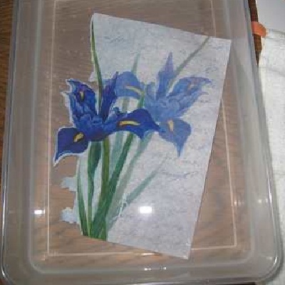 - Слагаме фрагмента за няколко минути в подготвен контейнер с вода. Докато размката на салфетката, на грундираната заготовка поставяме специално лепило за занаятите в техниката на декупаж.