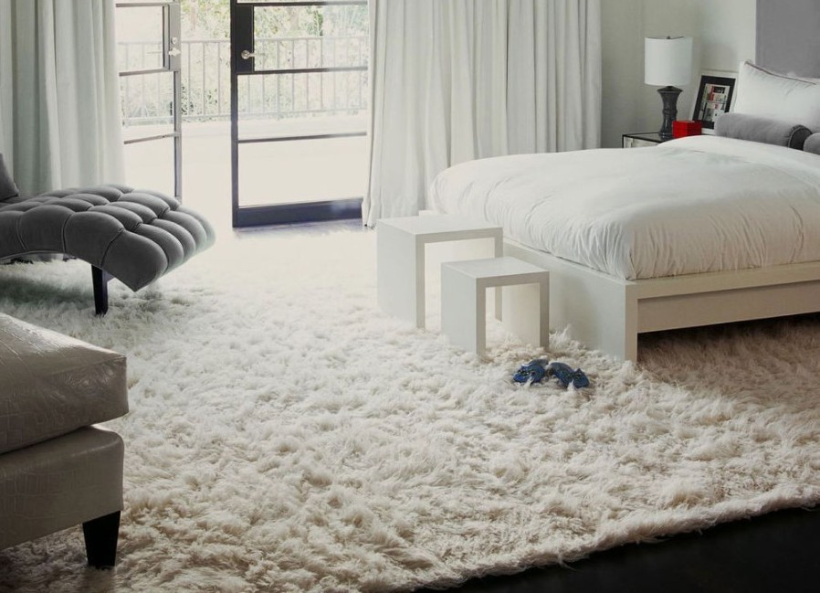 Цветът на покритието също е важен. Голям бял или лек килим освежава стаята, прави пространството по-уютно, визуално увеличава. Един обикновен килим с дълга дрямка ще изглежда лесен и ефирен, дори в съвременна обстановка с минимално количество мебели.