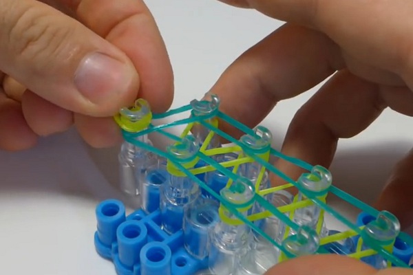 - По същия начин, вземете втората еластична лента на щифта по диагонал и я заредете на мястото й, като предварително издърпате крайната осем.