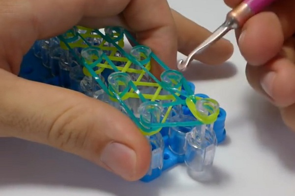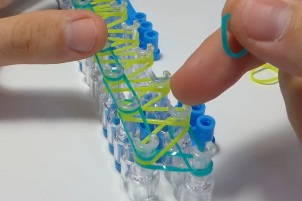 - Сега ще украсим втората част на гривна "Shnurki", на снимката можете да видите, че моделът е направен от два или три цвята от гумени ленти.