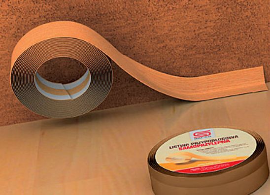 - Първият е гъвкав плосък самозалепващ се ролков перваз, който е лепкава лента с огъване в средата: едната половина е закрепена към стената, другата половина е фиксирана към пода. Монтирането на первази от този тип се извършва с помощта на лепилен слой на дъното на лентата. Можете да направите стая като цокъл за няколко часа, изглежда красива и красива. Но съществуват значителни недостатъци за подобно покритие. Този ограничен брой проекти, както и факта, че тази перваза е прилепнала към стената и няма канал за поставяне на окабеляване. В допълнение, покупката на перваза на борда все още е доста проблематична.