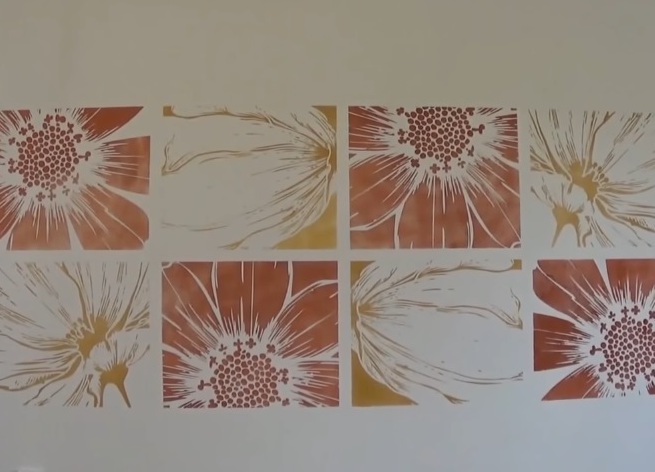 - Можете да започнете да рисувате стената. Ролката постепенно запълва дупките в шаблона.