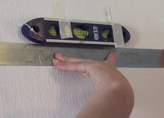 - Първо трябва да прикрепите шаблона към стената. За да направите това, нивото се използва, за да направи бъдещото рисуване да изглежда дори. С негова помощ е маркирана линия на стената.