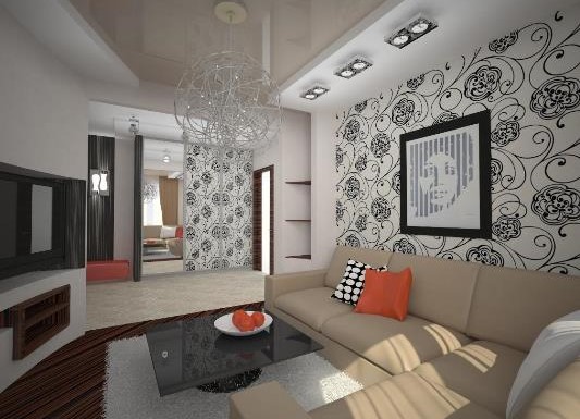 Ако сте щастлив собственик на голяма зала, тогава можете да използвате различни версии на съвременния дизайн на тапети, до нанасянето на покрития с ефекта на 3D.
