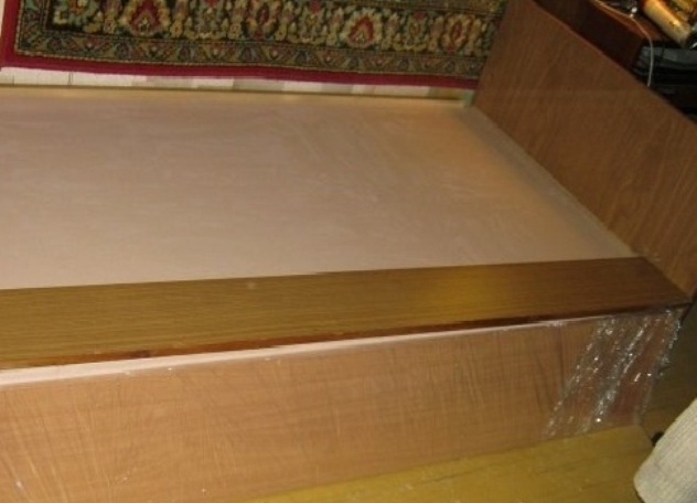- Хайде да направим краката за леглото. За да направите това, първо трябва да направите основа от шперплат и да го прикрепите към рамката. След това правим краката от парчетата дъски и по същия начин ги прикрепяме към основата. Вече използваме лепило и винтове. Така краищата на леглото трябва да изглеждат в края на краищата.