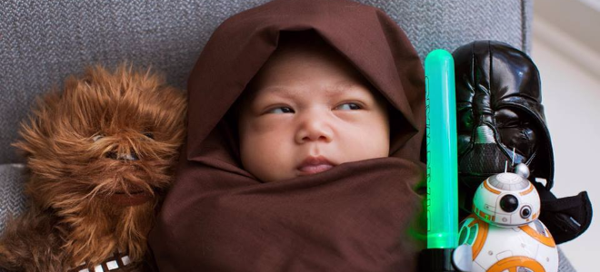 Новоизработеният баща се облече с Макс Макс в наметалото на Джедай и сложи играчка Чеубака, дроид BB-8, маска на Дарт-Вадър и медальон. За бебето не е отегчено, туника Джедай също се използва от кучето Марк и Прискила, който се нарича Звярът. Прочетете също