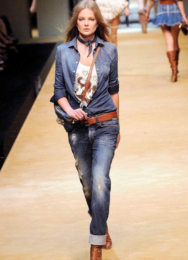 Дънки с дънкова риза също ще подчертаят каишката и малка торбичка с кръстосано боядисана кожена кожа или велур (може да се фриндинг.) Добавете обувки от каубой и вашето облекло изглежда съвсем ново.