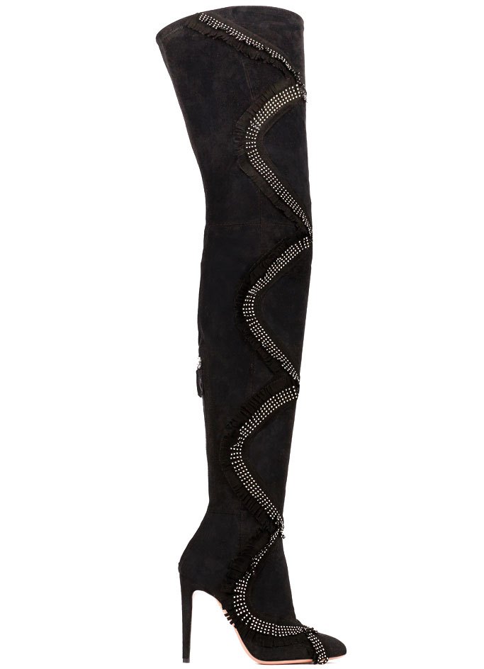 Модата за необичайния декор на ботушите от есенния сезон 2014 се отразява в модели на високи ботуши с ресни. Комбинацията от класически стил и игриви "юфка" от различни цветове ще даде на вашето изображение нестандартен акцент. Може би такъв модел е точно това, което липсва сред сивите цветове на есенния ежедневие.