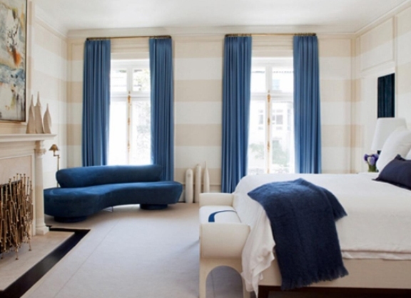 Сините завеси в спалнята символизират дълбочината, дават мир и почивка, намаляват агресията. Те са перфектно съчетани с бели нюанси на закрито, снежнобял тюл.