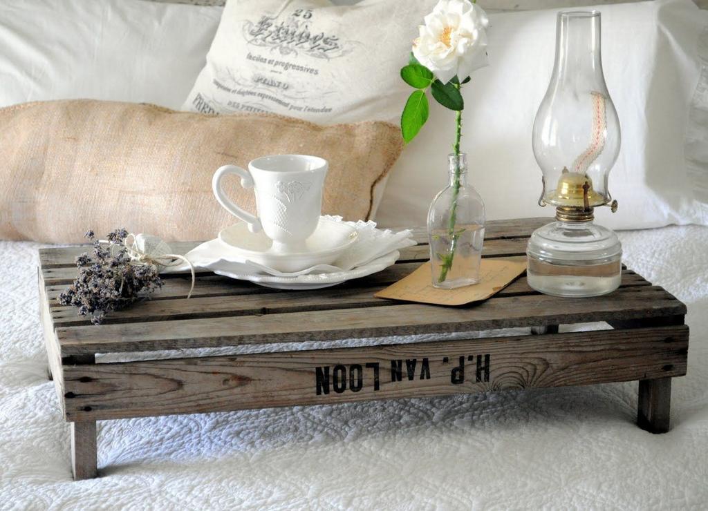 Дървена маса за закуска в леглото е традиционен вариант. Тя може да бъде монофонизирана, многоцветна, боядисана, с едно или няколко нива. Дъбовете, пепелта, кленовете, боровете или по-скъпите породи са покрити с топлоустойчив лак отгоре, така че повърхността да не се разваля от топлинното въздействие и да не абсорбира влагата. От гореща напитка дървото не се нагрява.