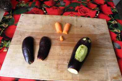 - Пригответе 2 патладжана, едната от които е малко по-голяма от другата, 2 различни моркови, 1 среден сладък пипер, 2 грах сладък пипер и дървени клечки за зъби за свързване на елементите.