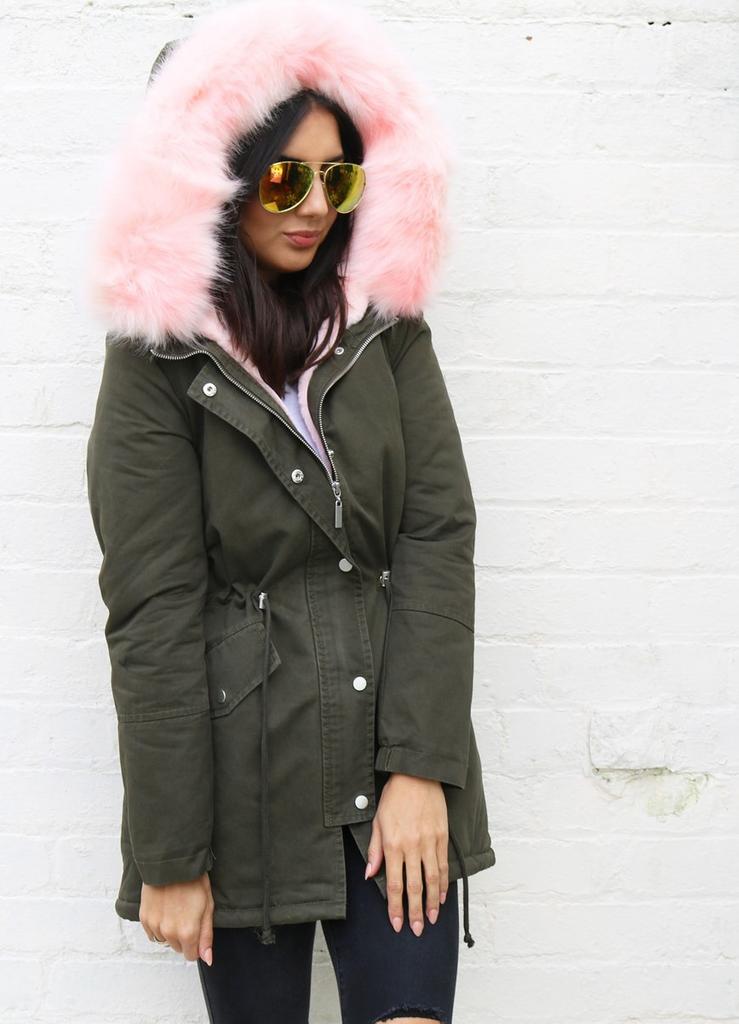Зелен парк с лека розова козина . Ако търсите по-нежна и женска опция, тогава стилно решение за вас ще бъде тъмният модел kaki с бледо розово покритие.