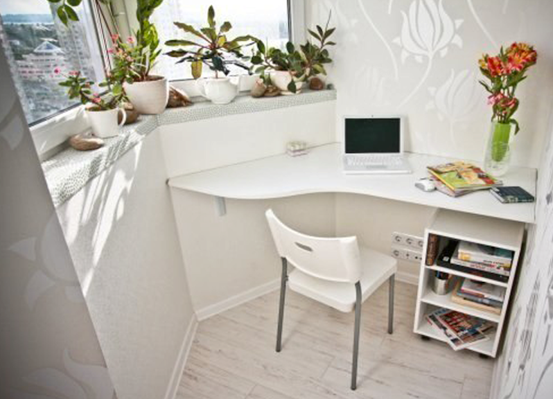 - Работно място . Задайте таблицата с функции и ергономичния стол. Различни шкафове и шарнирни рафтове също са от значение. От другата страна можете да инсталирате рафтове с любимата си литература. Тъй като параметрите на балкона са далеч от стандартните стаи, най-вероятно мебелите най-вероятно ще трябва да бъдат поръчани лично в завода или да бъдат събрани от импровизирани материали.
