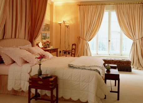 Спалнята е предназначена да възстанови силата и почивката, а шумът от улицата и ярката слънчева светлина ще пречат на пълния сън. За да се отървете от разсейването, използвайте тежки завеси от кадифе, брокат и други плътни тъкани. Те могат да се комбинират с полупрозрачна завеса и ламбрекин. Тази опция е подходяща за класически и ретро стил.