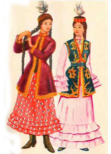 Костюмът на жените е определен според възрастта. По принцип женското облекло се състои от рокля "Keilek". Младите момичета носеха леки рокли с къдрици и фланелки - "косетек". Орнаментите украсяват не само долната част на роклята, но и ръкавите. За ежедневна употреба евтини платове, за празници - скъпи. Над роклята винаги се носеше двустранно яке, което се стягаше в кръста и се простира до дъното. Камизолите бяха и двете с ръкави и без тях и имаха характерен казахски орнамент под формата на бродерия със златни нишки. Освен това камизолът може да бъде украсен с мъниста, граница, ивица с лурекс. Младите момичета носеха ярки камизоли, възрастните - тъмни цветове. Също така важен елемент от облеклото бяха панталоните "dambal", носени под роклята. В хладно време жените биха могли да носят шампоана - прави рокля с дълги ръкави, носена над роклята.