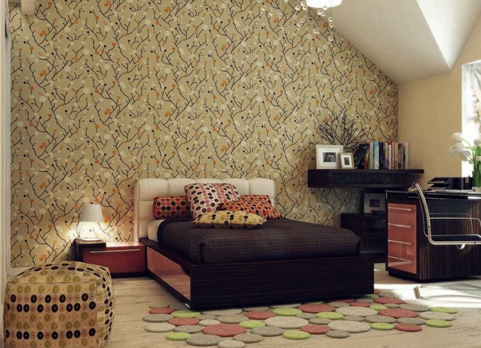 Тъмните тапети също могат да бъдат избрани за декорация на спалнята, те създават необичаен ефект. Просто не забравяйте, че ярките цветове могат бързо да се отегчават, така че просто трябва да купите любимия си цвят, след което този ремонт ще ви продължи по-дълго. Ярките модели също се вписват добре в някои вътрешни решения за спалнята. Ако картината е твърде голяма или привлекателна, тогава можете да приложите опцията за довършване с тапета само на една стена.