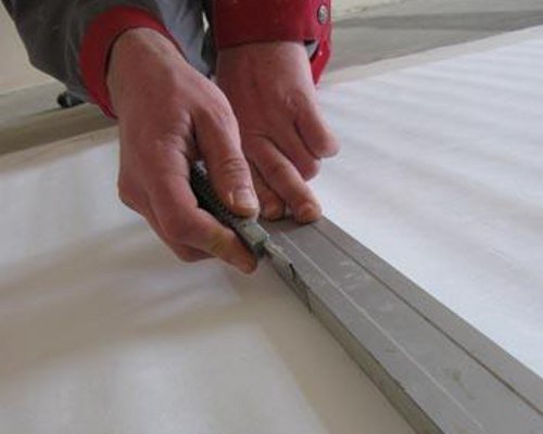 - Сега ще прибегнем до малък трик, колко лесно е да лепираме ставите на нетъкан тапет. Нанесете нивото и изрежете ножа с двата ножа.