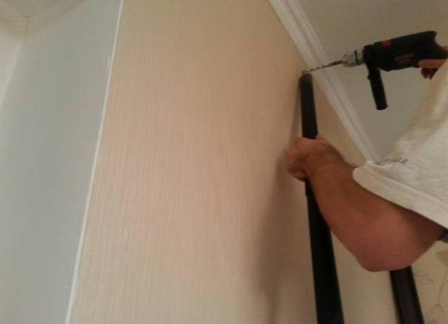 - Инсталиране . Пробийте дупка в стената на свредлото с диаметър 12 мм. Поставете държачите в отворите и покрийте образуваните слотове с шпакла. Сега тръбите могат да бъдат поставени върху държачите и да се закачат завеси върху тях. Освен това не е нужно да фиксирате корниз, тъй като под тежестта на завесите ще бъде здраво в каналите.