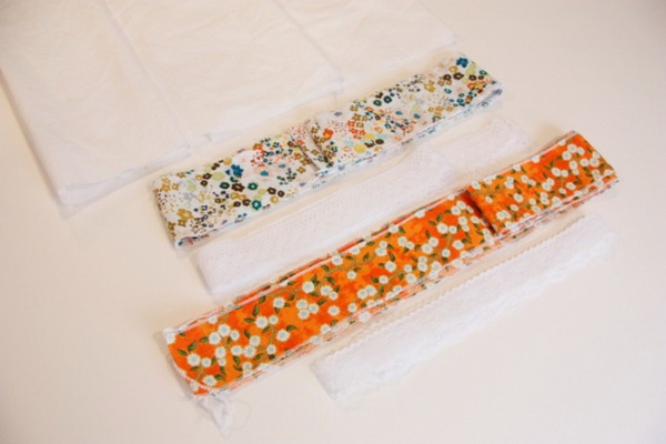 - Алтернативно шийте лента от плат на подгъва, след това дантела лента, отново лента от плат и отново дантела лента. Те могат да бъдат монофонични и могат да бъдат многоцветни, най-важното е, че в крайна сметка това се оказа стилно и оригинално.