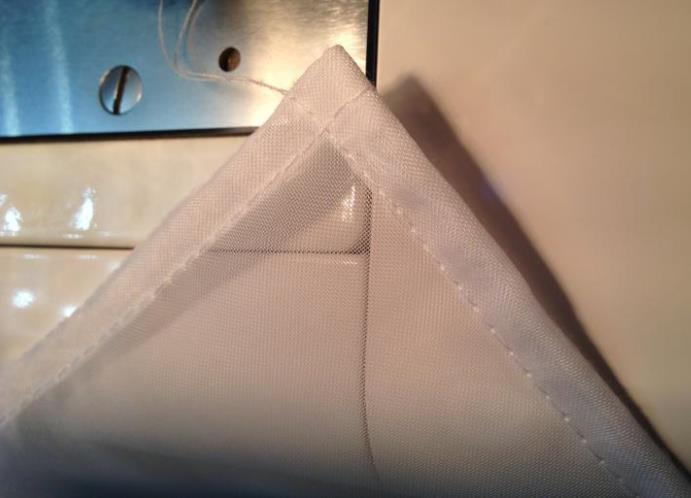 - На първо място, измерете необходимия завес за нас (или вземете готов тюл). В този случай вземаме под внимание, че е необходимо да оставите още 2.4 см в допълнение към подгъва от всеки край. Размерът на нашия подгъвач ще бъде равен на 8 мм, с четири слоя сгъната тъкан вътре.