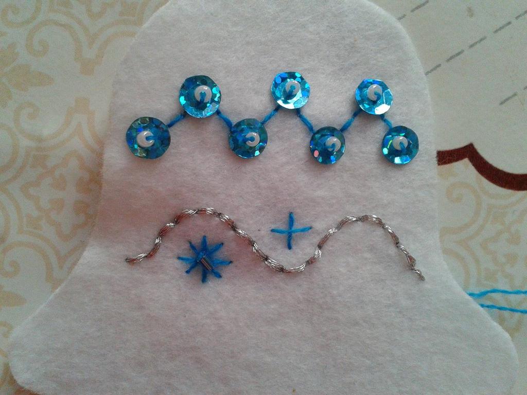 - Долната част на камбаната е украсена с пайети с бели мъниста по същия начин, по който върховете на триъгълни зъби от бродирани сини конци украсяват орнамента. Трябва да изглежда така.