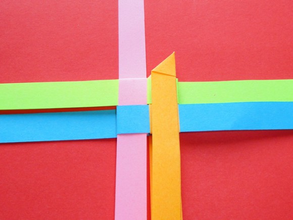 - Краят на работната лента се предава под друга лента и се затяга. Ако всичко е правилно, трябва да се получи първият рязък лъч на звездичката. След това направете за всяка лента от параграфи 4-7.