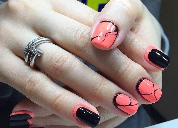Маникюр с модел на корали . Най-универсалният е яркият дизайн на ноктите с красив модел или печат. Можете да избирате корален лак като основа или да направите директно в този цвят картина. В последния случай е необходимо да изберете фон с контрастен цвят, най-добре бял или черен.