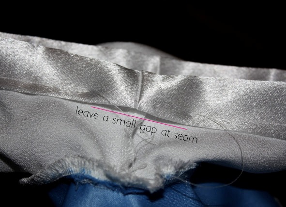 - Долният ръб на всеки плат е ушит (тюл по желание е невъзможен за подгъване). Атлас и шифон пришиват страничните ръбове, за да направят тръбите.