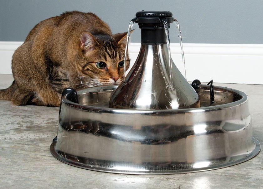 Пиенето може да бъде от два вида - просто, когато водата постоянно навлиза в резервоара, когато се използва, или по-сложна, където водата циркулира и работи като фонтан. Фонтанът за пиене осигурява на животното постоянно снабдяване с вода, подходящо за всички котки и малки кучета . Фонтанът е съд, в който се излива вода. Благодарение на малката помпа, водата непрекъснато циркулира, окислява, охлажда и почиства през филтрите. Свържете купата за пиене към електрозахранването със силен кабел. Животните, които харесват този начин на пиене, в непрекъснатото мърморене на водата има нещо естествено и те са очарователни. Дизайнът на чашите за пиене за котки може да бъде различен - има модел, в който да се движи водата, която трябва да натиснете лапата, водата в такива устройства излива капка или тече надолу по купола. Не е трудно да привикате животно да използва напитка.