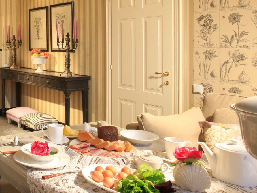 - Плосък тапет във вътрешността на кухнята . Има общоприети правила, които ви позволяват да коригирате някои недостатъци на планирането с помощта на някои модели на платното. Например малките орнаменти могат визуално да правят всяка стая по-просторна. Един добър ефект може да създаде различни ивици по стените. Вертикалните лъчи ще повдигат твърде ниски тавани, а хоризонталните лъчи ще ги направят по-ниски, но във втория случай тясната кухня вече ще изглежда малко по-широка.