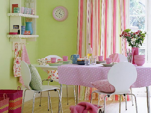 - Интериор на кухнята със зелени и светло зелени тапети . Няма малко фокус върху начина на запълване на стаята ви с пролетни или летни цветове. Ако ролята на свежата зеленина в теб ще направи тапет, тогава защо този очарователен фон не се разрежда с ярки импрегнации, символизиращи цветя. Такива елементи могат да бъдат розови или червени покривки, завеси, цветни саксии, покривки за маса, различни аксесоари.
