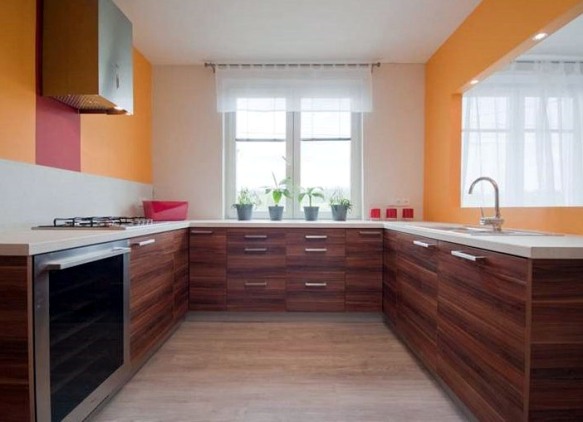 Това оформление осигурява работа в кухнята на няколко човека, които няма да се намесват помежду си. В този случай площта на кухнята трябва да бъде приблизително 2,4x2,4 метра. Мивка и печка могат да бъдат поставени близо до една стена, а шкафовете за храна и хладилникът са в другата. В ъглите на U-образната композиция успешно ще се настанят телевизор и микровълнова фурна.