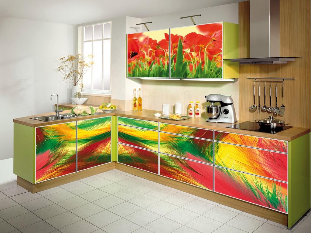 - Печат на снимки на базата на полимерен филм . Този метод е по-евтин и по-достъпен. Тук можете да поръчате най-фантастичното изображение, дори да използвате при производството на лична снимка. Червена кухня с фотопечат, синьо, зелено, лилаво - всички варианти се създават достатъчно бързо, без ограничения и са доста достъпни за масовия купувач. Без този метод - устойчивостта на повреда на филма е малко по-ниска. Понякога филмът започва да се ексфолира, особено в кухни с лоша вентилация и обикновено служи за по-кратък период от UV отпечатването. Поставянето му на фасадата трябва да се извършва много внимателно, като се избягва най-малкия вид на малки мехурчета.