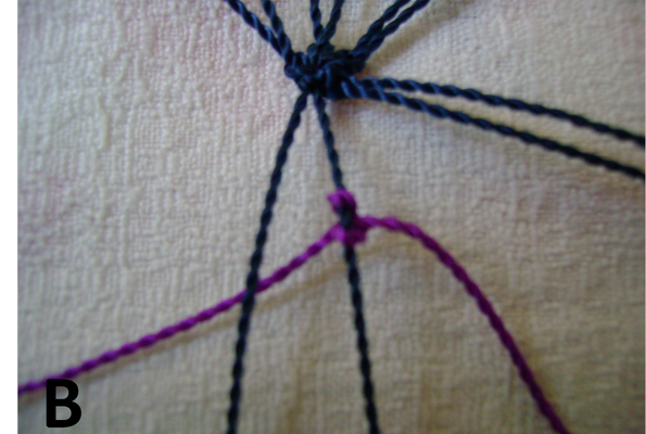 - Ние свързваме виолетовите нишки на фигурата заедно, тъкайки тъмносините и лилави пластири (А). Ние свързваме тъмносините нишки заедно и тъкаме лилавата нишка, след което свързваме всички нишки заедно (В). Процедурата се повтаря с останалите нишки на фигурата (С).