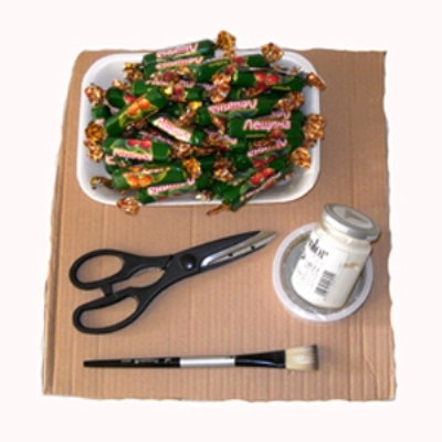 - Взимаме по-големи бонбони, вмъкваме клечка за зъби в нея, обгръщаме блестящ филм и украсяваме крака със зелени цветове. От оргазма, нарязани квадратчета и клечки за зъби правят "паунда".