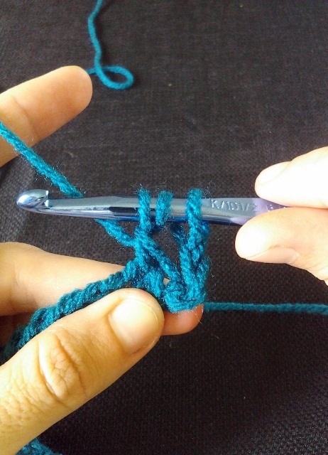- Прокарайте контурите, като издърпате конеца през петия въздушен контур. На куката за кука след тази стъпка трябва да има 4 бримки.