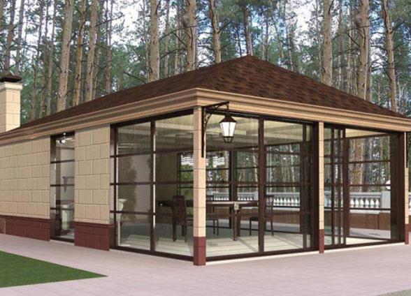 В затворени сгради можете да се отпуснете при всяко време. В този случай, често беседки за вили с барбекю правят остъклени. В тях лошото време не може да спре да яде вкусно барбекю, а в същото време можете да се насладите на природата зад прозорците на строителството. За изграждането на този тип, първо трябва да изградите фондация. В затворено беседка е много важно да подреждате печката, така че димът от нея да не пречи на почивката ви.