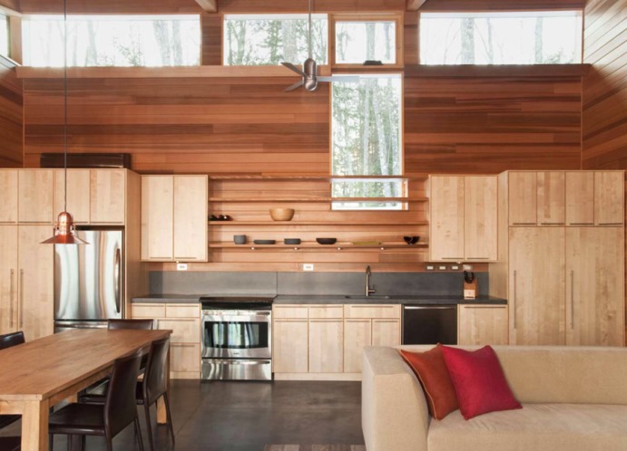 Панелите на стената под дървото са добре комбинирани с други видове покрития. Те могат да украсяват всички стени и дори таванът, или да отделят отделна част от стаята, например зона за отдих в хола, спалня, трапезария в трапезарията, престилка в кухнята или работна зона в частния офис.