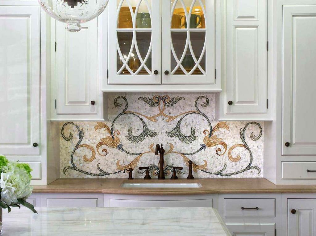 Разбира се, навсякъде в тази стая може да се постави мозаечна снимка, но не всяка домакиня може да се похвали с просторна кухня, където има свободно пространство по стените за голям цветен плат. Следователно, най-практично е да украсите кухненската престилка с красиви модели от най-малките камъчета. Тук, под качулката на плота или в зоната за миене, тези декорации ще изглеждат най-печеливши и елегантни. В допълнение, мозайката е лесна за почистване от сажди или мръсотия и ще служи като отлична допълнителна защита на вашите стени от пара, пръски от вода и мазни петна.