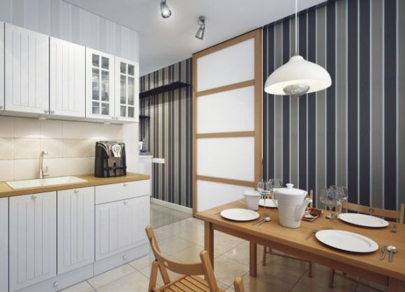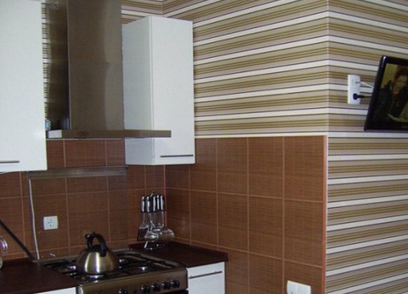 Учените са установили, че топлите тонове в кухнята насърчават правилното храносмилане при хората, а студените нюанси действат в обратна посока. Ето защо, за да проектирате кухнята с тапети тапет, трябва да използвате дълбоки топли тонове. Например, бялата и зелената ивица тапети ще изглежда страхотно в кухнята с дървени мебели. Освен това е по-добре да не се покриват всички стени в кухнята с ивици тапети. Лентата може да се намира само на една стена или само на другата. И можете да комбинирате ивици тапети с различен завършек, например, с керамични плочки, при условие, че сянката на плочките се повтаря в ивици на тапет.