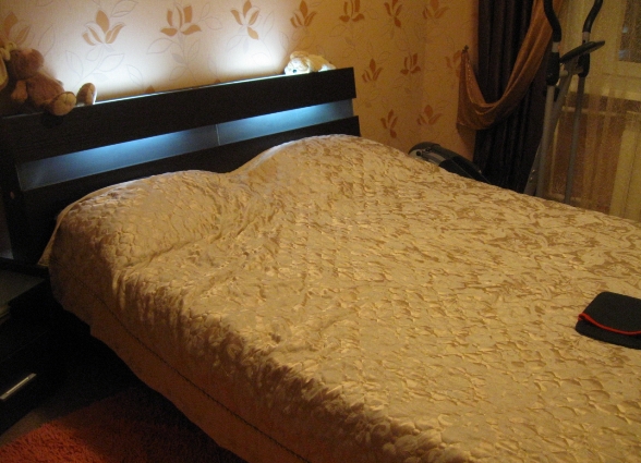Често главата на леглото е украсена с осветление. За тази цел малки прожектори или флуоресцентни луминесцентни лампи се монтират на широка страна на гърба на леглото. Модерните и красиви ще гледат светлинните потоци, насочени нагоре от главата на леглото. В допълнение към това осветление на гърба, можете да организирате огледало и дори рафтове. Главата на леглото може да бъде разположена в ниша, украсена с LED осветление.