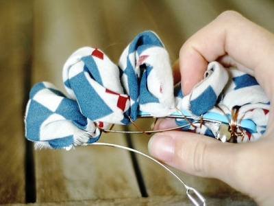 - Вържете края на кърпата в барета с тънка тел. Обърнете шалчето във флагел, направете го и го фиксирайте с тел.