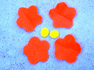 - Поставете пет монети върху филцовете и ги кръговете около контура с молив, заточвайки ъглите на венчелистчетата. По същия начин, но използвайки монети с малък диаметър, изрежете кръгчета от филц. Огънете цветето наполовина, отгоре сложете друг огънат по същия начин, после още един и още един.