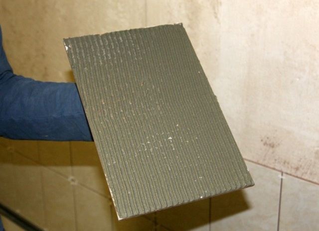 - Сега можете да продължите към основната фаза на полагане. Подготвяме лепилото за плочките въз основа на инструкциите на производителя. Поставяме го върху плочката с гладка шпакла.