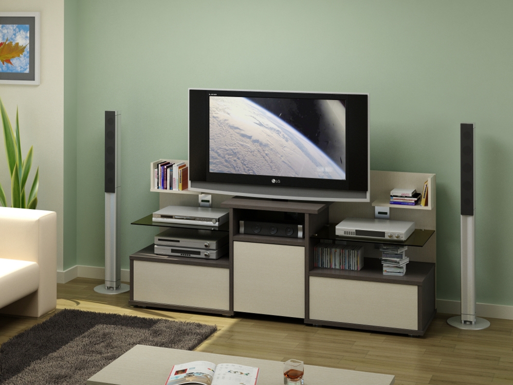 Стъклото стои перфектно в модерен интериор . Повечето от тях имат рафтове, които лесно се приспособяват за домакински нужди. Особено популярен е черен цвят, който хармонично се комбинира с телевизионния екран. Всеки от щандовете е проектиран за определен товар. Дизайнът на стъклените конструкции е лесен и оригинален, благодарение на разнообразните начини за довършване на материала и претенциозните форми.