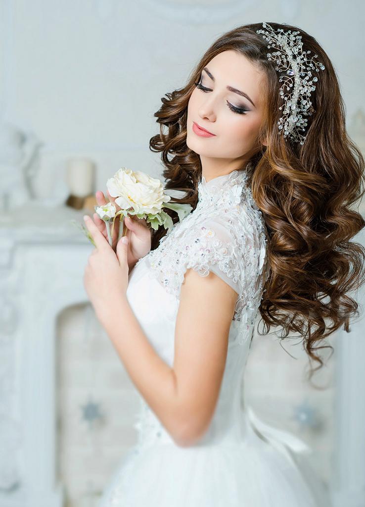 Не по-малко секси и в същото време чисто положени от едната страна къдрици. Те могат да бъдат украсени с малки цветя, венчелистчета, фиксирани върху косата с помощта на клипове.